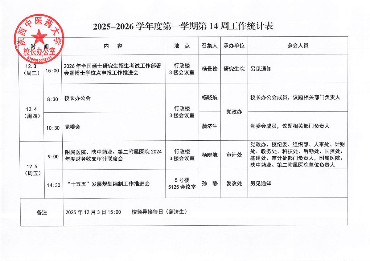 2025-2026学年度第一学期第14周会议安排