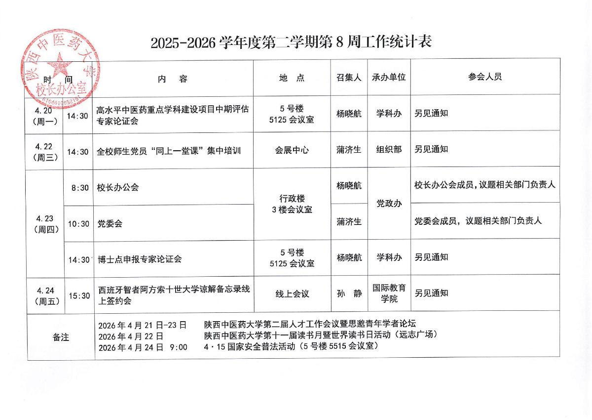 2025-2026学年度第二学期第8周会议安排