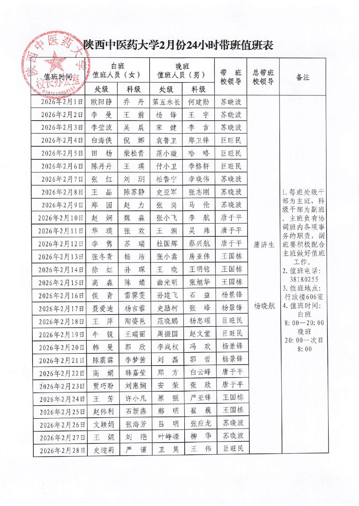 陕西中医药大学2月份24小时带班值班表